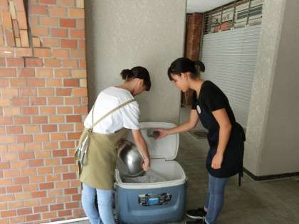 エプロンを着けて実際にカフェの仕事の一部を体験させていただいてます。引き続き2日目、3日目もよろしくお願いします。