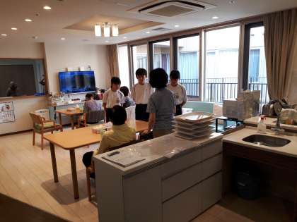 特別養護老人ホーム エリザベート成城での体験の様子です。職員の方から仕事の内容を丁寧に説明して頂いてます。生徒たちも集中して話を聴いています。この後の活動も頑張ってください。