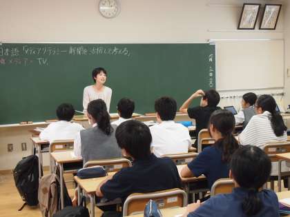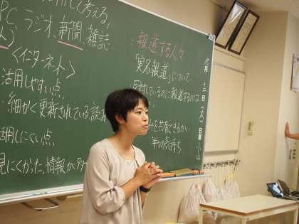 6校時は教科『日本語』の校内研究です。1年生の1クラスが残り、今年から新しくなった教科『日本語』を行い、教員全員でその成果を検証します。京都アニメーションの事件を取り上げ、インターネットと新聞とでは、調べ方や時間などにどのような差があるのかを学んでいます。