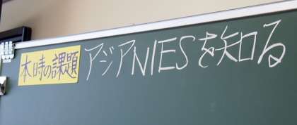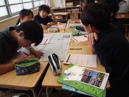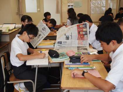 1年生の社会は世界の地理、アジアを学習しています。導入として取り入れているのが、毎日教室に届けられる新聞を広げ、これから学ぶ地域に関する記事からアジアに関する記事を探してワークシートに記入していきます。