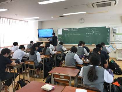 3年生の数学の授業です。関数を学びます。図形が動くことによって出来る重なり部分の面積を考えますが、デジタル教科書を使って分かりやすく学習を進めています。(副校長)