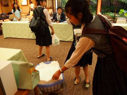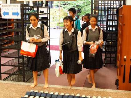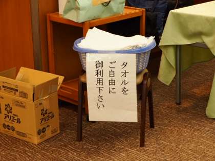 最初の班が戻ってきました。突然の雨に降られかなり濡れています。宿の方がタオルを用意してくださいました。