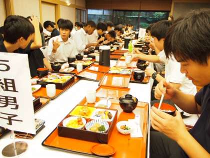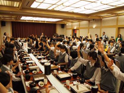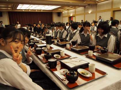 奈良パークホテルで、昼食です。実行委員から修学旅行後半に向けての心構えのお話の後「いただきます」で美味しいお弁当を食べています。