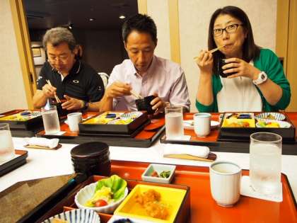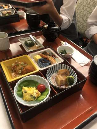 昼間の奈良パークホテルで出たお弁当を紹介いたします。ご飯の他にお蕎麦も出て生徒たちはたいへん満足しているようでした。もちろん教員も同じです。