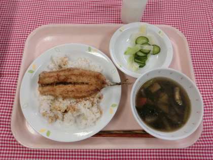 今日は、和食の献立です。旬のさんまをかば焼きにしてご飯にのせた丼ぶりを出しました。山椒の効いたタレがかば焼きに合いますよ。さんまに含まれる脂は、EPAやDHAといってコレステロールを下げて血液をさらさらにする効果があります。