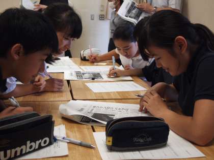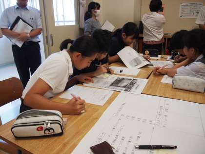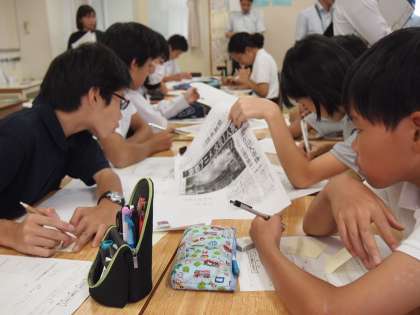 一方新聞で調べるグループには、2枚の記事が配られ、生徒たちは次々に調べた事実を付箋に書いて貼っていきます。