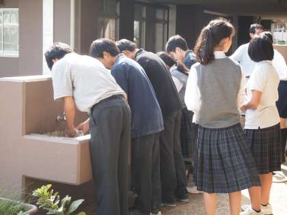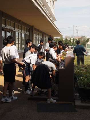 避難訓練前に校庭ではスプリンクラーで水をまいたので、上履きの裏は砂がついています。その砂を拭いたぞうきんをきれいにする美化委員です。「授業もうすぐ始まるから少し急いでね〜」と先生から言われましたが、委員の仕事を全うするのも大切なつとめ。急ぎながらもしっかり仕事をしています。