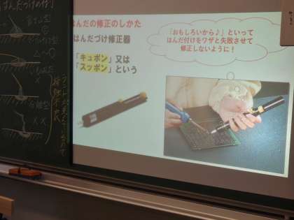 人生初のハンダ付けという生徒も多いはず。ものづくりの楽しさは一度味わうとやみつきになるかもしれません。ということで、こんな注意書きを画像で提示しています。