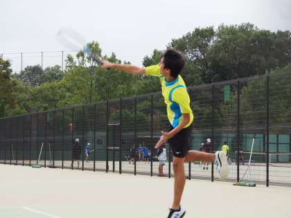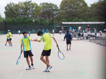 今日の最初の対戦相手は渋谷区の代々木中学校。練習の成果を発揮して4対1で勝利しました。特にダブルスの試合では、チームワークが何より大切です。試合中には、点数を取る度にお互いに意志を、気持ちを確認し続けます。