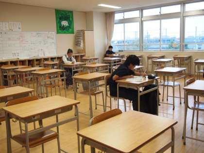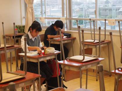 朝7時30分すぎに校舎を回ると早くも教室には明かりが灯り、今日の中間考査前最後の追い込みをかけるフナキボ生が各階にいます。「どの教科が一番大変ですか?」の問いに8期生は『…全部です』7期生は『う〜ん。社会です!』という答え。勉強の成果が100%発揮されることを祈ります。