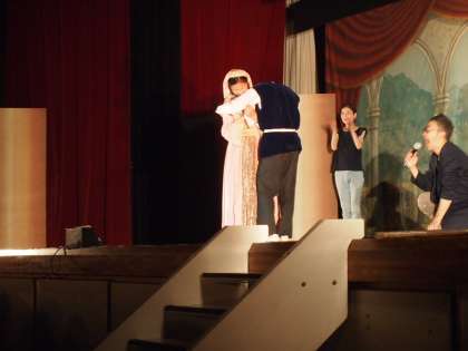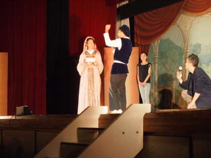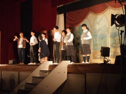 後半の演劇鑑賞教室では、代表生徒か壇上にあがり、発声方法を学んだり、今演じたヴェニスの商人の一場面を衣装を来て演じてもらいました。「恥ずかしがって声も出ない学校も沢山あるのですが、セリフもふりもしっかり演じてもらってよかったです」と後でスタッフの方が感想を述べていたほどの迫真の演技に会場は大きく盛り上がりました。