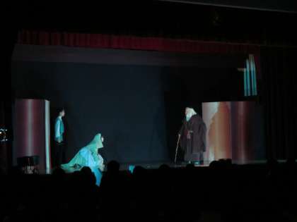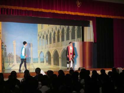 今年度は演劇の鑑賞と演劇教室の2部構成で実施いたしました。『ヴェニスの商人』の演劇を今日は劇団の方に来ていただき、生の劇を鑑賞しました。(田村)