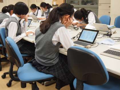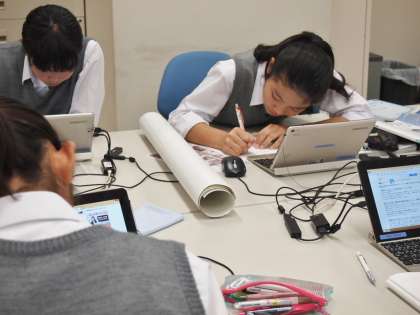 2年生の社会は地域学習を進めています。グループを組み、副読本やインターネットなどで調べています。これからの調べ学習では、書物とインターネットの両方を組み合わせて使いこなすことが必要になる時代がきます。