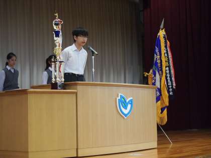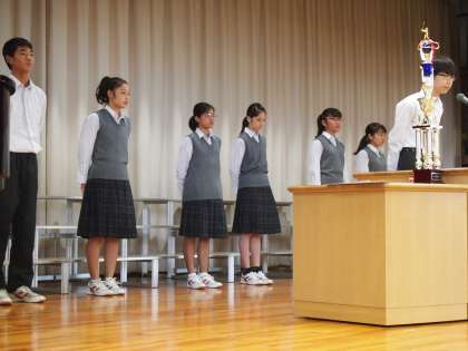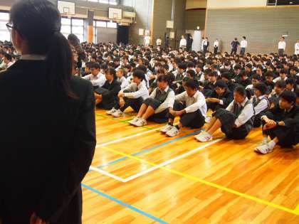 生徒会朝礼では、各専門委員長からの挨拶もありました。どの委員会もしっかり考えられた挨拶を原稿なしで皆の前で話しをするところが、今のフナキボのすばらしいところです。3連休明けということもあり、聞いている生徒の体調を考慮し、途中から座ってもらいましたが、多少時間が長くなっても視線は舞台の上にしっかり注がれています。