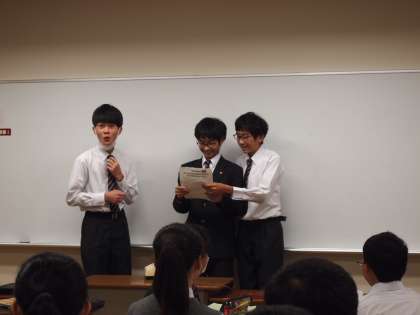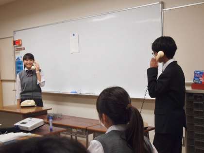 練習をしてきたとはいえ、原稿を見ずに、英語で会話をし、しかも、演技力もすばらしい!フナキボの生徒の英語力と演技力はなかなかですね。最後に他のクラスのやりとりを映像で見て学んでいました。