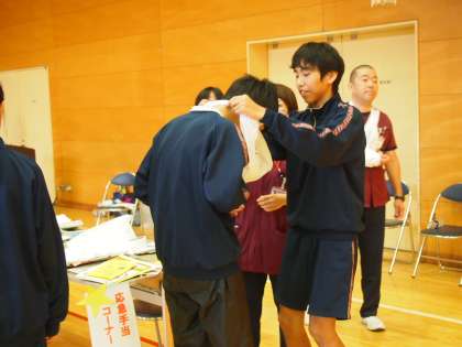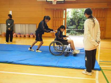 車椅子体験や三角巾による応急手当ての仕方も学んでいます。