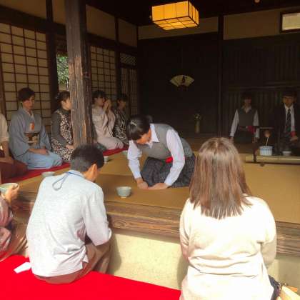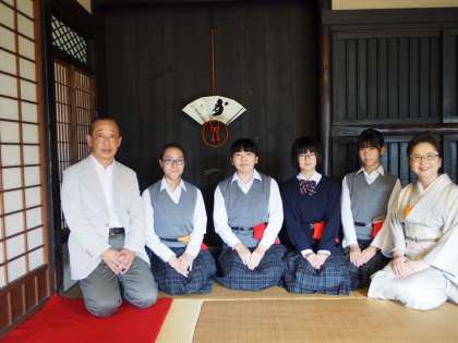 普段は体育館の上にある畳の部屋で練習をしていますが、このような場所でお茶をたてるとまた気持ちが引き締まる感じがします。茶道部の生徒にとっては、運動部でいえば練習試合にあたるのかなあ、と思いました。最後、家屋を後にするときにはフナキボ生に茶道部らしく丁寧に見送ってもらい、さわやかな気持ちで民家園を後にしました。