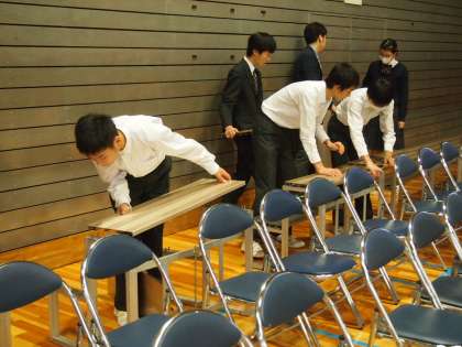 放課後の体育館では、会場づくりが着々と進んでいます。ここでも働き者のフナキボ生たちの努力が会場づくりを支えています。