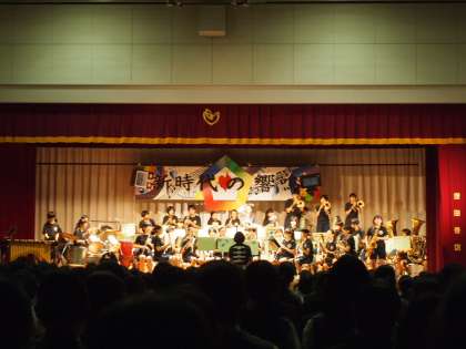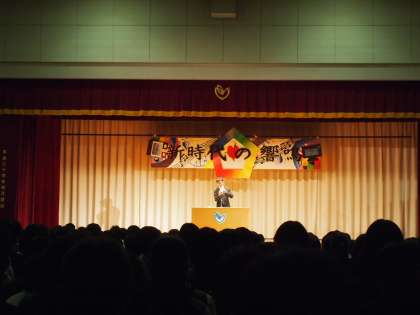 英語のスピーチ、外国紹介、そして吹奏楽部の演奏に続き、1年生合唱です。
