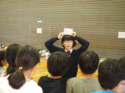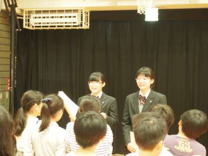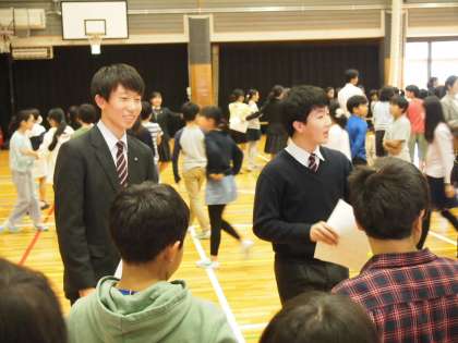 グループに分かれて校舎案内をする前に自己紹介をしています。それぞれ工夫してわかりやすさや優しさをかもしだしていて、いつもとちょっと顔つきが違いますね。