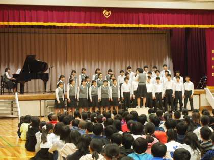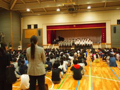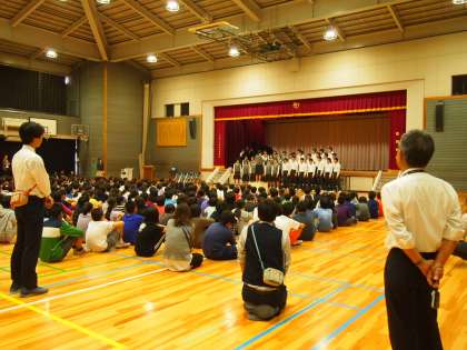 小6見学会(‘11期生を迎える会’)の画像で、昨日掲載できなかった場面をお届けします。まずは、8期生の学発優勝クラスの合唱を披露している場面です。毎年、この場面では圧倒されている小学生の表情が印象的なのですが、正座(!)をして感慨深く見守る小学校の担任の先生の姿がありました。小学校の時に担任をした子どもの成長ぶりを実感しているのかなあ…と。