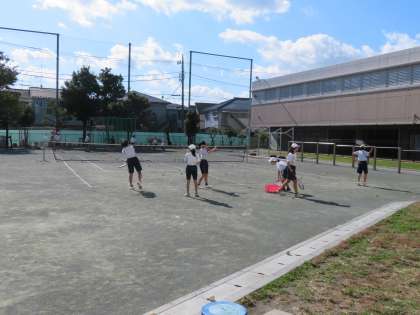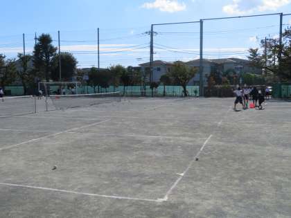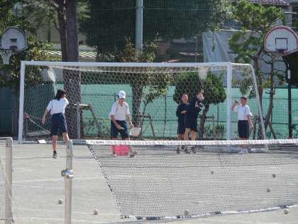 校庭ではソフトテニス部が練習に取り組んでいます。気温も朝に比べて高くなり、運動日和です。(田村)