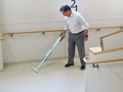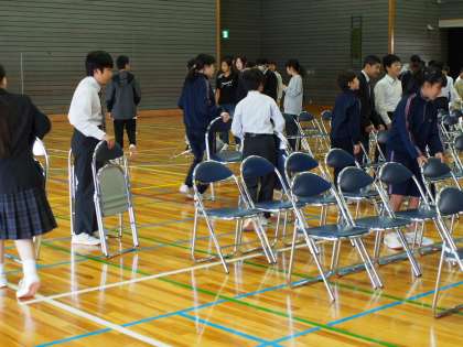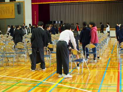 NIEタイムの撮影を終えて、階段を降りていくと、掃除をしている学年主任がいる、いつもの光景です。そして声が聞こえる体育館に行ってみると、そこには新入生保護者説明会の椅子を用意する10期生の姿が。10期生もあと5ヶ月で「先輩」になるのですね。