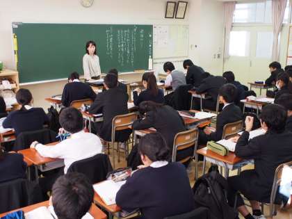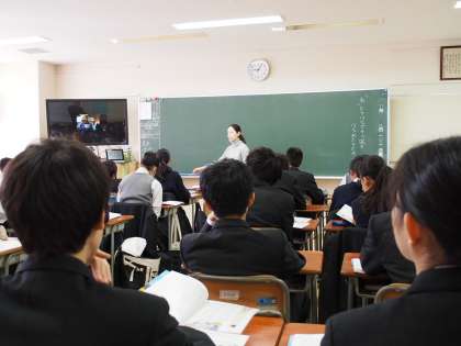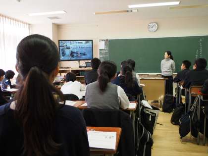 2年生道徳の授業です。阪神淡路大震災の時、避難所で体験したことをもとに、中学生が自分たちの役割について考えるテーマです。今の中学生は皆未経験の地震なので、実際の映像や画像を見て考えを深めています。