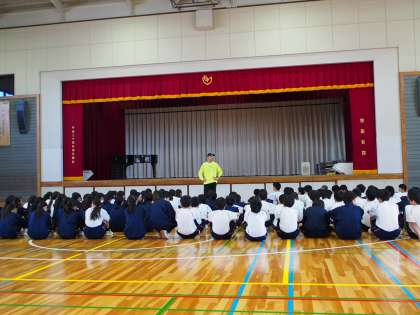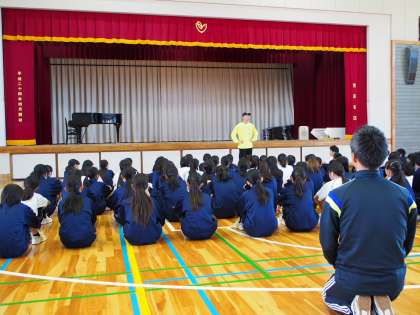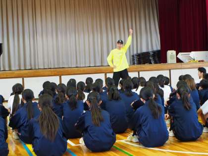 授業の終わりに、集合がかかりました。それまで、曲がかかってノリノリで踊っていた10期生たちは「走って〜」という先生の声で一斉に舞台前に集合。と同時に瞬時に静かになり、ダンサーの方の話を聞く態勢になります。その間数秒。すっかりフナキボ生です。