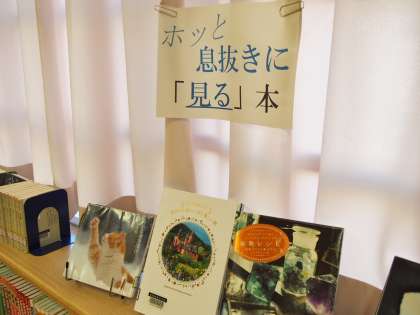 図書室はいつも企画ものてあふれています。その時の話題のコーナーあり、本の紹介があり。フナキボ図書室はいつも輝いています!