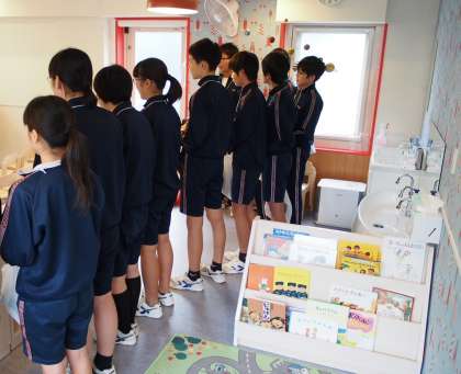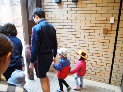 注意事項を聞いたあとは、手をつないで公園に散歩にでかけます。手を握るのにも、相当気を使います。