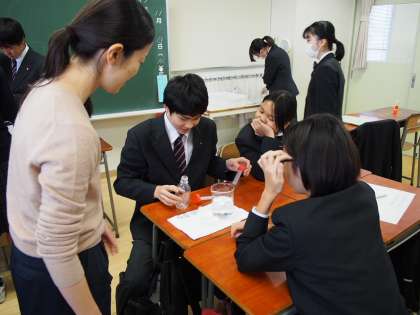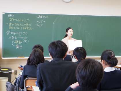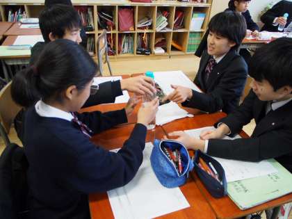 2年生理科では雲をつくる実験をしています。「雲ができるのに必要な条件は何か」を考えながら、ペットボトルと特殊なキャップを班にひとつ配布、あとは班で相談しながら進めます。