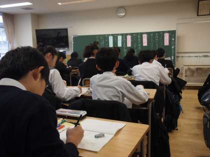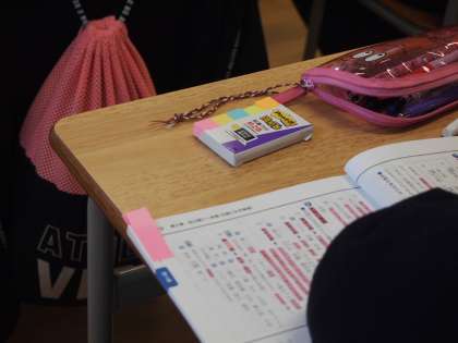 こちらの10期生のクラスは、国語の文法の授業を進めています。きちんと書かれた板書をノートに写す作業をしています。きちんと付箋を用意して教科書やワークに貼っている生徒もいます。中学校に入って教科ごとのノート整理にも工夫のあとが見られるようになりました。