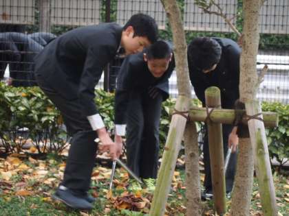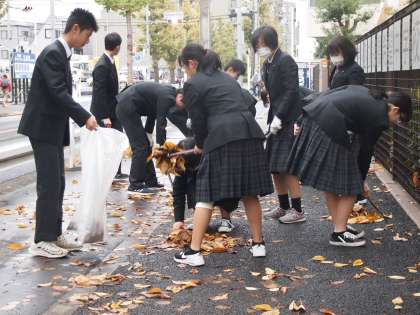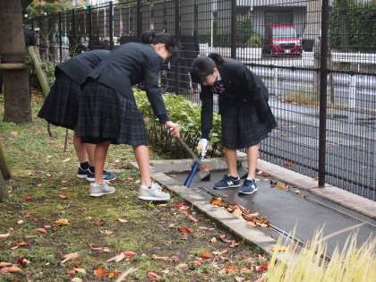 歩道も行き交う自転車に気をつけながら、落ち葉を拾っています。北側の門近くにはけやきの木があるので、落ち葉拾いには絶好の場所です。