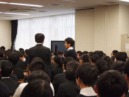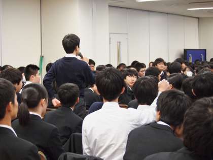 9期生のビブリオバトルでは,進行役の図書委員から「場を盛り上げる質問をどんどん出してください」「先生からでもいいです」という呼びかけがあり、最初は遠慮していた生徒も次々に手を挙げて質問をしていました。そして、先生からも…。内容も「盛り上げる質問」から「奥深い質問」まで様々です。さすが、中学2年生!