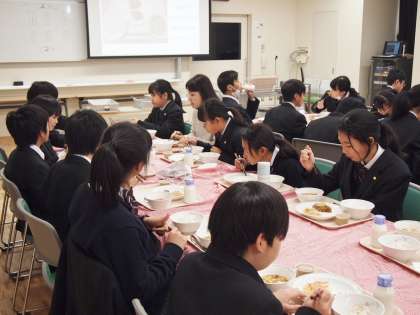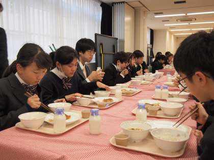 ランチルーム給食では、担任はもちろんのこと、普段は職員室で食べている先生方も加わって食べています。