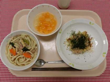 今日は、肉うどんとお好み焼きで大阪風な組み合わせの献立でした。