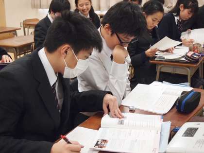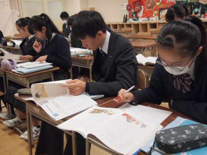 さて、英語の新出単語を使ったビンゴゲームが始まりました。なぜかいつものような「やった〜、ビンゴ〜!」という雰囲気ではなく、真剣な表情が続いています。なぜならば、先生が日本語で言っているからです。日本語の意味と英単語を教科書で確認する表情が真剣です。それでも、ビンゴが出ればうれしいですね。