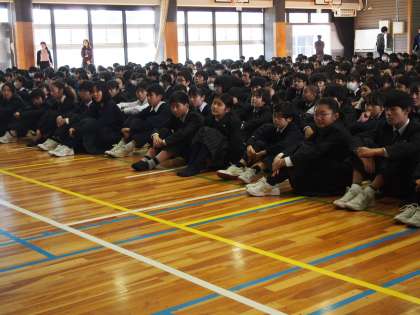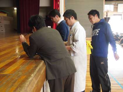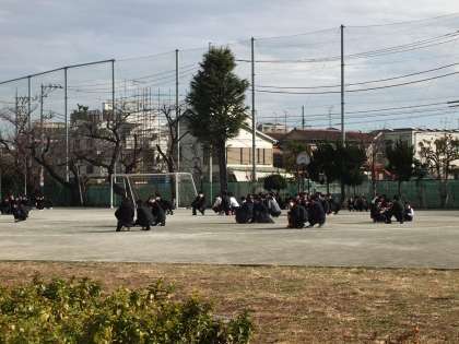 今日の避難訓練は、昼休み中の地震を想定したものでした。校庭で遊んでいる生徒ももちろん姿勢を低くして、身の安全を確保します。この姿勢を教員からの指示がなくてもすぐにできるところが、今のフナキボのすばらしさです。避難場所は体育館。放送後5分弱で整列完了です。
