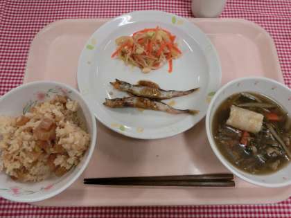 今日は、秋田県の郷土料理「きりたんぽ汁」を出しました。