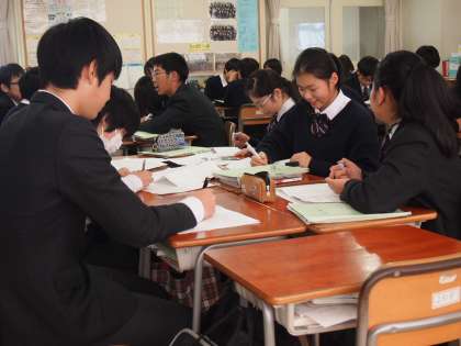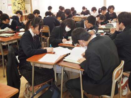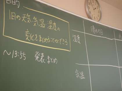 2年生の理科の時間です。1日の天気、気温、湿度を班員が時間を区切って記録した情報を持ち寄り、グループを作って共通点を話し合う作業をしています。今年も、どの教科でもよく見られた話合い活動ですが、あと2日でこれも見納めです。
