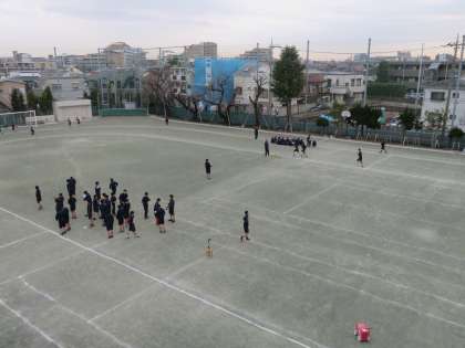 校庭では体育の授業を行っていて、持久走を自分たちのペースでしっかりと走っています。