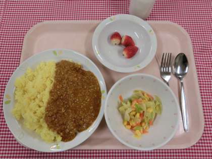 今日のカレーは、大豆がたっぷり入った「豆入りキーマカレー」です。大豆は、「畑の肉」と呼ばれるほどたんぱく質が豊富で、鉄分やビタミンB1、食物繊維なども多く含まれています。栄養満点の大豆をふんだんに使用してつくったカレーです。ぜひ、残さずたくさん食べてください。