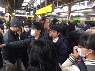 朝のラッシュは少しおさまりましたが、人は多いです。 船橋希望中・山本浩靖
