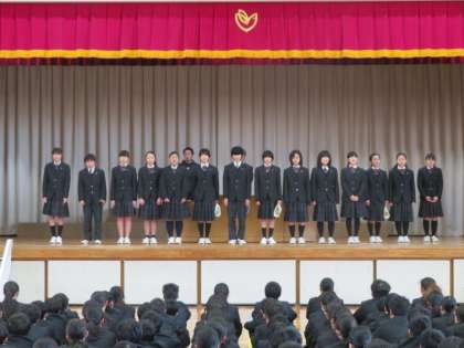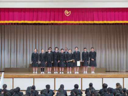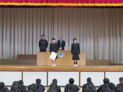 校長先生のお話に続いて、表彰が行われました。バレーボール部、吹奏楽部、バドミントン部、そして区のガリレオコンテストが入賞しました。おめでとうございます。(田村)