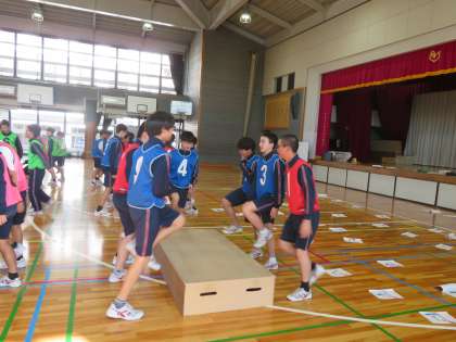 2年生男子体育の授業の様子です。体づくり運動の一環で、今日は音楽に合わせて段差を上り下りする運動を行っています。頑張ってください。(田村)