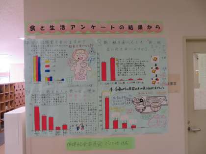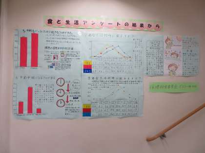 保健給食委員のポスター係が作成した、「食と生活アンケート」のまとめが、1階東階段と西階段前に貼ってあります。