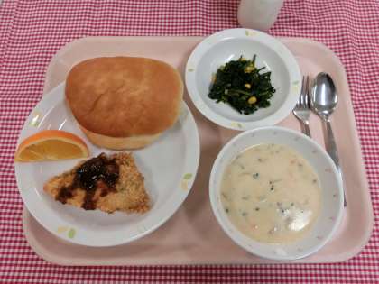 パンは手で開けるようになっているので、白身魚のフライをはさんでいただきます。ほうれん草のソテーを一緒にはさんで食べてもおいしいです。ぜひ、楽しんで食べてください。