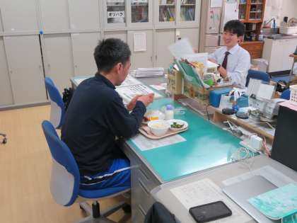 今日は、大居先生が一足はやく給食を食べています。魚フライをパンにはさみ、とてもおいしそうです。(田村)