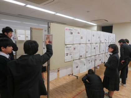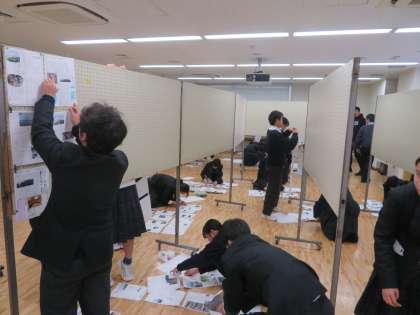 展示発表会準備の様子です。多目的ルームでは、移動教室や職場体験の新聞、理科の自由研究などの展示が進んでいます。